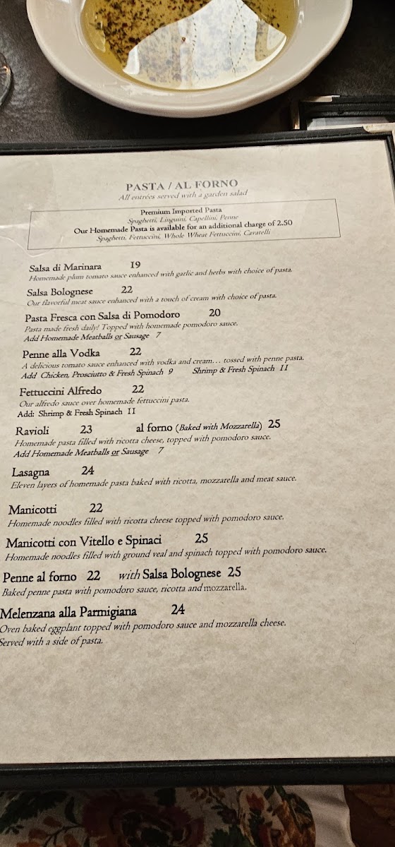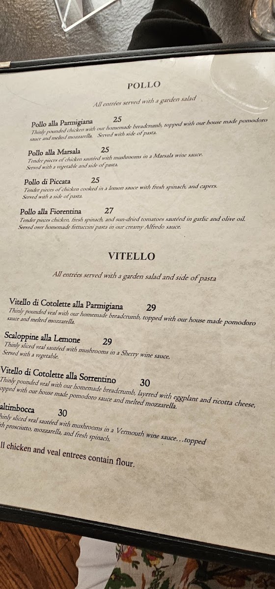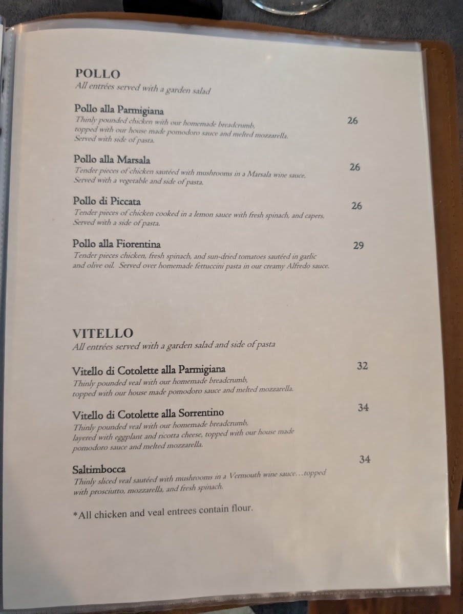 The menu is a delightful journey through classic Italian dishes, featuring a range of offerings from homemade pastas to succulent proteins. Signature selections like Vitello Saltimbocca and Pollo Alla Parmigiana highlight the restaurant's commitment to quality ingredients, each dish expertly crafted with generous olive oil and aromatic herbs.
